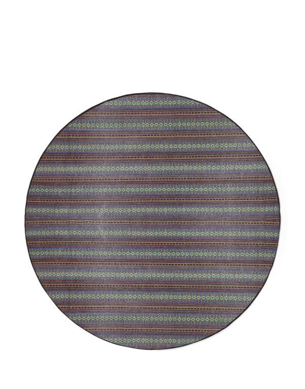 Mit seinem großzügigen runden Format von 180 cm Durchmesser eignet sich der Teppich ideal als Blickfang im Wohn- oder Schlafzimmer, unter dem Esstisch oder in offenen Wohnbereichen. Die hochwertige Materialmischung aus 60 % Polyester, 30 % thermoplastischem Polyurethan und 10 % Baumwolle sorgt für Langlebigkeit, Formstabilität und ein angenehmes Laufgefühl.